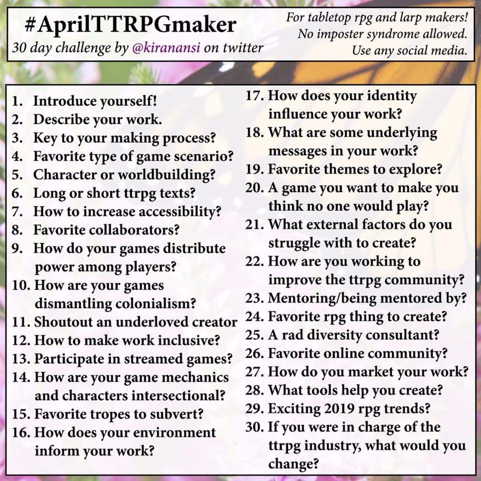 17. How does your identity influence your work? Looking back to #10 and #12, I wouldn't be putting as much thought into inclusivity and diversity if that wasn't something I had to deal with in my personal life. Experiencing institutional shit and growing up in the wild world of boys-club D&D gave me very clear perspectives on what I don't want anywhere near my tables, and the sort of stories that I want to tell. Sorry if this is vague, but I don't like crossing the streams of venting and content creation - I save the word-vomit about my personal life for my Mastodon account and my group chats.